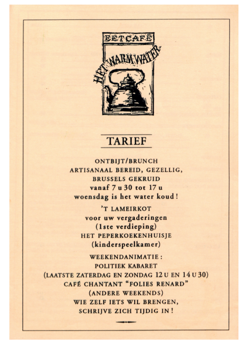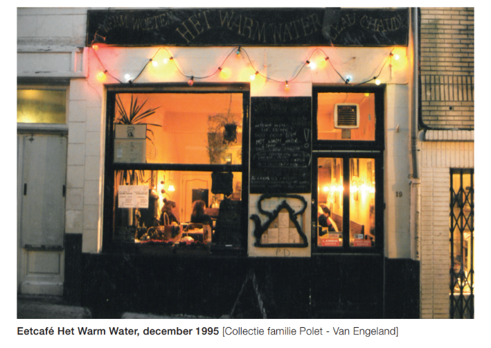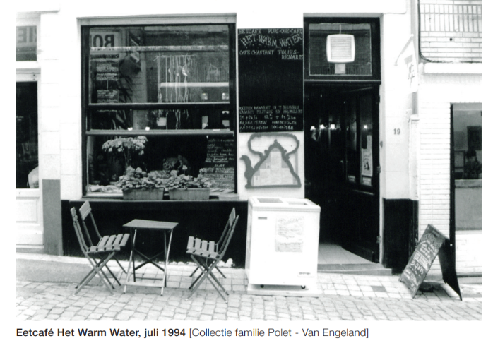 Deze maand zetten we daarom ’t Warm Woeter in de kijker: Het Warm Water was een invloedrijk Brussels eetcafé in de Vossenstraat in de Marollen opgericht door Lieve Polet in 1993. Het was een totaalconcept dat stadsverbondenheid, gemeenschapsvorming, cultuur, duurzaamheid en sociaal engagement combineerde. Lieve Polet koos bewust voor deze volkse wijk om tegengas te geven aan de verburgerlijking en om de authentieke sfeer te behouden. Het café begon als ontbijt- en lunchplek met veel huisgemaakte gerechten en Brusselse specialiteiten zoals ettekeis met malse peir. De inrichting en de naam verwezen naar het verleden van de locatie waar wijkbewoners hun warm water kochten. Cultureel was het een broedplaats met een podium en piano en diende het als thuishaven en repetitielokaal voor het Brussels cabaretgezelschap 't Crejateef Complot Zonner Complekse waardoor het Brussels dialect en de volkscultuur werden ondersteund. Lieve Polet zette zich ook in voor de leefbaarheid van de buurt en kreeg de bijnaam Madame Potelet vanwege haar acties voor een autovrije Vossenstraat. Het Warm Water creëerde een sterk sociaal netwerk en werd een aangename ontmoetingsplaats voor zowel Brusselaars als toeristen.